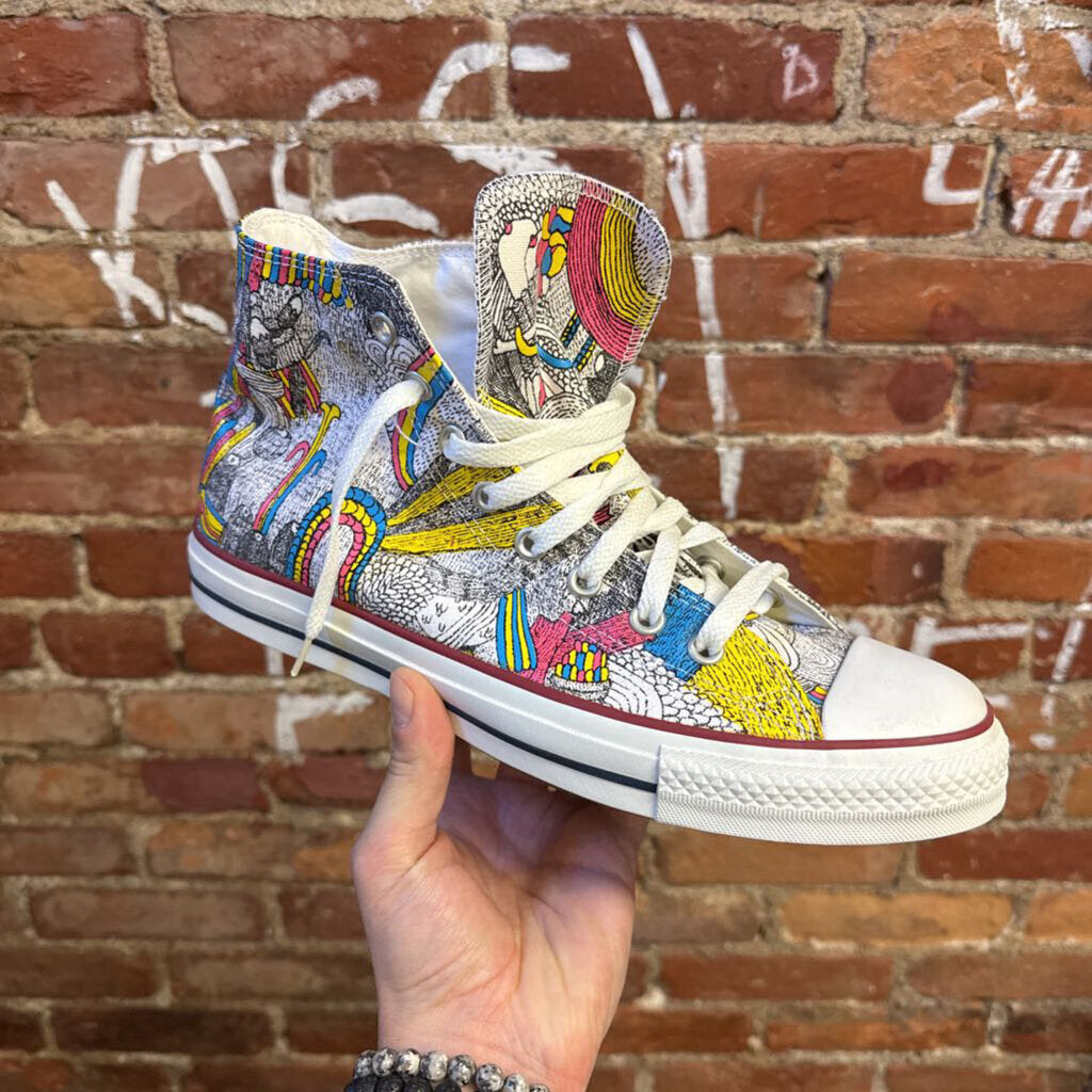 Converse Chuck Taylor All Star high-top sneakers featuring the rare “Jigram” graphic print. The canvas upper showcases an intricate, illustration-style pattern with bold pops of yellow, pink, blue, and black layered over a white base. Finished with classic white rubber toe caps, contrast foxing stripe, and traditional lace-up closure. A standout collectible Chuck that blends art-forward design with everyday wearability.