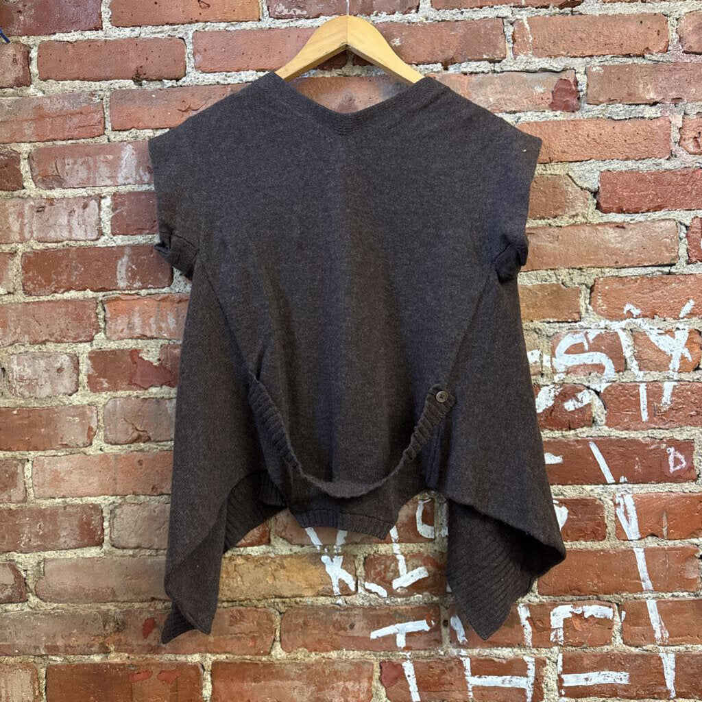 A beautifully unconventional knit that blurs the line between vest, wrap, and sculptural layer. This Tom Scott cashmere vest is crafted in a rich brown tone with an asymmetric, draped silhouette that falls effortlessly over the body. The open front and extended panels create natural movement, while subtle ribbing at the hem and edges adds quiet structure.
